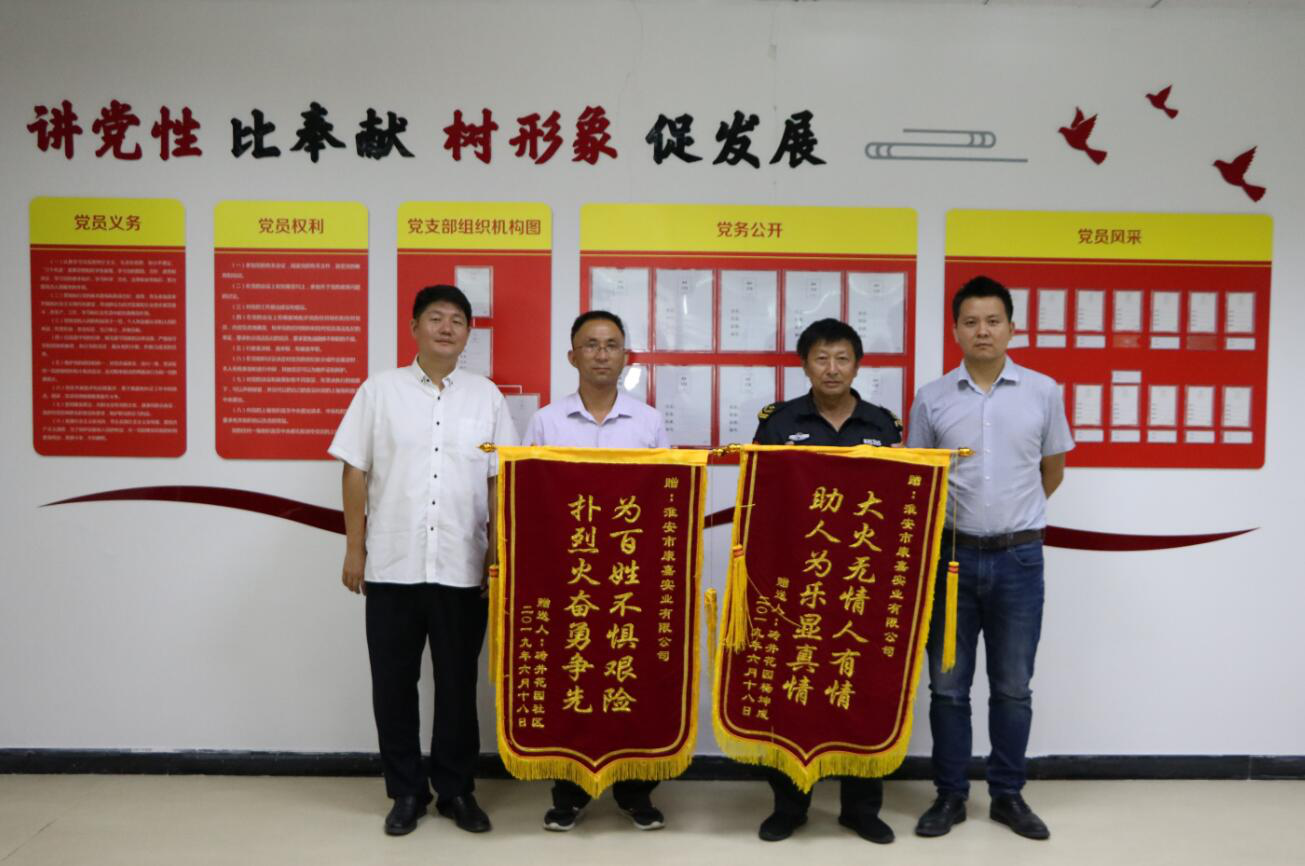 2019年7月10日上午,公司樓下傳來一陣鞭炮聲,磚井花園社區(qū)相關(guān)人員專程來到公司,將兩面印有“大火無情人有情,助人為樂顯真情;為百姓不懼艱險,撲烈火奮勇爭先”的錦旗親手送到公司,以表對公司員工當(dāng)日救火之行的感激之情。